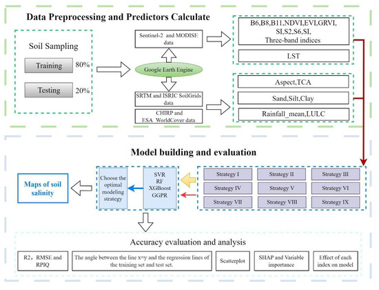 Figure 2 illustrates the framework of the methodology employed in this study. Initially, data preprocessing and predictors are calculated. The soil samples were divided into a training set and a testing set with a ratio of 8:2. Subsequently, relevant remote sensing environmental variables were extracted from Sentinel-2, MODIS, SRTM, ESA WorldCover, etc., datasets, followed by necessary preprocessing. The next step involved model building and evaluation. The remote sensing environmental variables were categorized into nine distinct strategies based on the SCORPAN model. Four machine learning models were then utilized for prediction, with the results being evaluated for accuracy. Additionally, SHAP values were applied to assess the influence of each variable on the model. Finally, the optimal model from each strategy was selected to generate the salinity maps.