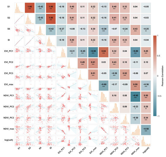 Following the logarithmic transformation of salt, the data distribution approximates a normal distribution. A strong positive correlation exists between NDVI_PC1 and EVI_PC1 with the logarithmically transformed salinity, showing correlation coefficients of 0.5 and 0.45, respectively. In contrast, NDVI_max exhibits a strong negative correlation with the logarithmically transformed salinity, having a coefficient of −0.58, which is also highly significant. Comparatively, S1, S2, and SI show low and non-significant correlations with salinity.