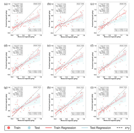 As illustrated in Figure 4, the SVR model under Strategy IX demonstrates the best overall performance, achieving an R2 of 0.62, RMSE of 0.38 g/kg, and RPIQ of 2.38 on the testing set. Although the model exhibits slight systematic underestimation in areas of high salinity (α = 25.25° and β = 27.93°), it maintains strong generalization capability. Closely following, the SVR model under Strategy VIII achieves commendable results, with a testing set R2 of 0.60, RMSE of 0.39 g/kg, and RPIQ of 2.31, alongside similarly small deviation angles (α = 25.80° and β = 28.63°), highlighting its stability. Notably, the RF model under Strategy III shows marked overfitting, with an R2 of 0.80 on the training set dropping sharply to 0.46 on the testing set (RMSE = 0.45 g/kg, RPIQ = 2.00), underscoring the challenges of using complex models with limited sample sizes.