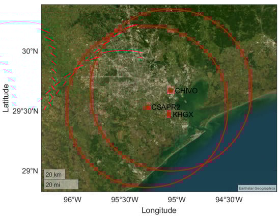 Data acquisition during the campaign was performed based on the novel Multisensor Agile Adaptive Sampling (MAAS) approach. The MAAS framework was first implemented to control a dual radar network operating from the Stony Brook Radar Observatory []. In the TRACER/ESCAPE campaign, this versatile framework was adopted to control the position of the Colorado State University C-band polarimetric radar (CHIVO, N, W) and the DOE 2nd Generation C-band ARM Precipitation Radar (CSAPR2, N, W) towards a target convective cell after monitoring the KHGX radar []. The two radars (CHIVO and CSAPR2) were aimed at the same convective cell and were able to track convective cells throughout their life cycle, relying on real-time positioning from subsequent NEXRAD scans. The MAAS strategy and the amount of data collected produced a unique dataset that can be used for a wide range of applications. The uniqueness of this dataset must be emphasized: dedicated ground-based radar instruments, scanning a few selected cells at high temporal frequency, primarily provide the opportunity to obtain a good reconstruction of the wind field in the scanned area, based on Doppler data. In principle, a convective cell can be followed from its early stages, as soon as it is detected by the ground-based radar, thus allowing analysis at both the case study level and the overall statistical level. The MAAS frame has taken advection into account during cell tracking to locate RHI and PPI scans at the core of the cell. Due to the complexity of the convective events, the possibility of merging and splitting, and the selection of the cells to be tracked based only on the NEXRAD monitoring, it often happens that the tracking is not optimal. For example, the selected cell is not tracked until its decaying stage because another cell appeared more interesting, the NEXRAD advection correction is not very precise, and the RHIs often do not accurately capture the core of the cell. These kinds of issues must be considered when analyzing the TRACER/ESCAPE field campaign dataset, bearing in mind that there must be a good trade-off between the complexity of the phenomena analyzed and the descriptive capabilities of this unique dataset.