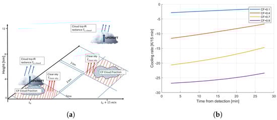 (a) Schematic of the temporal evolution of a convective system. The updraft fills only a fraction of the grid pixels. (b) Temporal evolution of the cloud cooling rate for different cloud fractions (CF) as indicated in the legend. A cooling rate of 30 K/15 min is assumed for the convective cell. The presence of NUBF causes a significant underestimation of updraft strength.