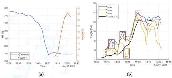 Time-series of geostationary and radar ground-based characteristics of the case study selected on 7 August 2022 from 6 pm UTC. (a) shows the minimum of the brightness temperature (cyan line) recorded within the cell by the IR channel of the geostationary radiometer; the orange line is the  area (right vertical axis). (b) compares the height of the minimum  within the cell on the IR image (black line) and the maximum height of the 20, 30, and 40 dBZ levels from the CSAPR2 radar RHI scans. The red boxes identify features that are commented on in the text.