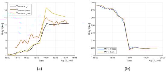 Time-series of geostationary and radar ground-based characteristics of the case study selected on 7 August 2022 from 6 pm UTC. (a) compares the height of the minimum  within the cell on the IR image (black line) and the maximum height of the 20 dBZ level from the CSAPR2 radar RHI scans (orange line) to the cloud-top product, parallax corrected, from SAF software (yellow line). (b) shows the minimum of the brightness temperature (cyan line) recorded within the cell by the IR channel of the geostationary radiometer and from the parallax-corrected product from SAF software (orange line).