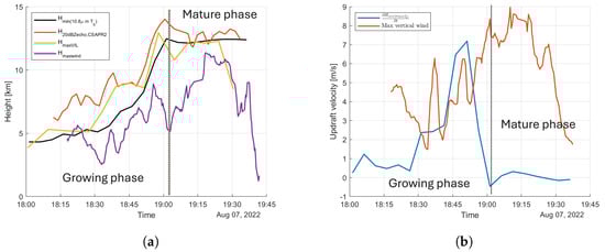 (a) Temporal evolution of different parameters (as indicated in the legend) describing the evolution of the convective cell shown in Figure 3, Figure 4 and Figure 5 and Figure 8. The black line is derived from the GEO-IR  by the closest temperature profile sounding, whereas the other lines are based on radar observables of the 3D structure of the convective cell. (b) The time derivative of the height of  minimum (cyan line) is compared to the maximum vertical velocity retrieved by the dual Doppler radar measurements within the cell (orange line).