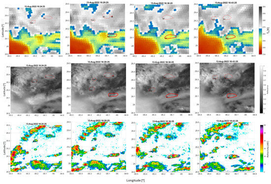 While the radar is detecting several smaller cells, it is common to see, in the IR image, widespread cold (around 220–230 K) clusters associated with anvils formed below the level of zero buoyancy from the detrainment caused by the underlying convection. Depending on the atmospheric winds and the amount of mass detrained, the anvil spreads around and masks what is happening underneath. This is one of the cases in which geostationary sensors are not effective at all in the detection and tracking of convection, unless overshooting tops occur in the scene [,].