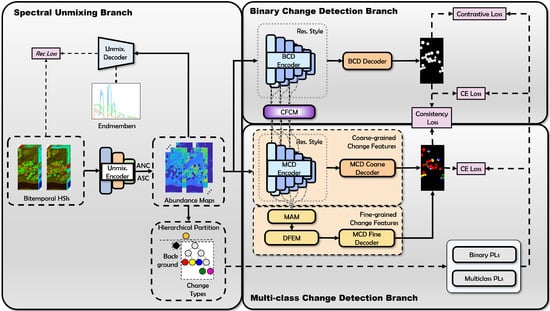 - We propose a dual-branch learning framework that integrates binary and multiclass change detection, extracting sub-pixel level features through a spectral unmixing branch (SUB), while optimizing feature interaction between branches via a Cross-Feature Coupling Module (CFCM).