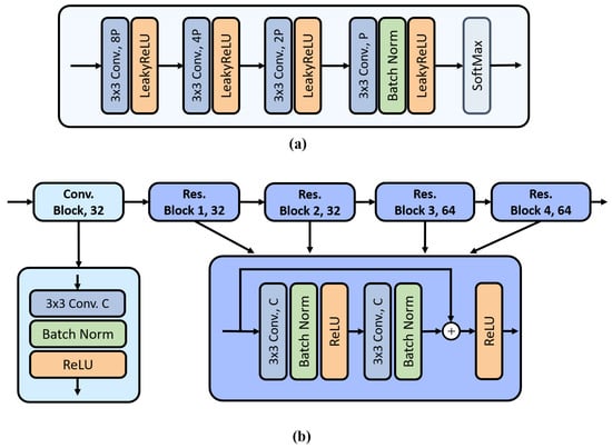 where the matrix represents the pixels in the hyperspectral image, N denotes the total number of pixels, and B represents the number of spectral bands. The endmember matrix contains the pure spectral signatures, with P representing the number of endmembers. The abundance matrix describes the proportions of each endmember in each pixel, while represents the noise matrix accounting for measurement errors in the hyperspectral image. Under the Linear Mixture Model (LMM) assumptions, the abundance values must satisfy two fundamental constraints. The first is the Abundance Nonnegative Constraint (ANC), which requires all abundance values to be non-negative, ensuring physical meaningfulness. The second is the Abundance Sum-to-one Constraint (ASC), which stipulates that the sum of abundance values for each pixel must equal one, reflecting the complete composition of the pixel. The assumptions can be denoted as and . To model this process using neural networks, the abundance encoder is employed to transform the high-dimensional HSIs from B dimensions into the abundance representation of P dimensions. The detailed architecture of this abundance encoder is illustrated in Figure 2a, and the abundance estimation process can be mathematically formulated as follows:
