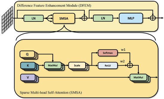 where represents channel concatenation operations, and implements feature upsampling using deconvolution. To effectively extract and enhance change features, the DFEM module models relationships between arbitrary positions within sequences through a self-attention mechanism based on the Transformer architecture, thereby effectively capturing long-range dependent features, as shown in Figure 4.
