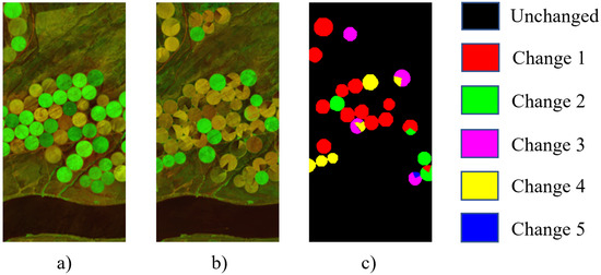 Finally, while deep learning-based change detection methods can achieve superior detection performance through data-driven nonlinear transformations and adaptive learning of high-level feature representations, their data-driven nature makes them heavily dependent on the accuracy of training sample labels. In practical applications, obtaining large-scale, accurate labeled samples for change detection tasks is challenging, which creates a bottleneck in deploying deep learning methods. To address the label scarcity issue, existing studies often employ unsupervised mechanisms to generate weakly labeled samples for feature learning [14,15,16]. However, these weakly labeled samples typically contain noisy labels, which affects the process of model training. This is particularly problematic in an MCD task, where different types of changes exhibit varying degrees of label noise. Therefore, designing appropriate network architectures and learning strategies to effectively mitigate the unreliability of pseudo-labels remains a key challenge in improving the robustness of change detection models.