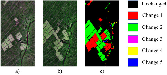 WSCDNet was validated on three hyperspectral image datasets: two real multi-temporal datasets collected by the EO-1 satellite’s Hyperion sensor (Hermiston and Yancheng datasets) and one simulated dataset (Urban dataset), as shown in Figure 6, Figure 7 and Figure 8. The Hermiston [33] dataset consists of bi-temporal HSIs captured by the sensor in 2004 and 2007, with a spatial size of and containing 242 spectral channels. The Yancheng dataset [34,35] comprises two images from 2006 and 2007, with a spatial size of and containing 132 spectral channels. Both real datasets include ground truth labels for both binary change and multiclass change scenarios, with multiple changes encompassing five different change categories. The Urban dataset [36] was constructed through simulation, with its base image captured by the Hydice sensor in 1995, featuring a spatial size of and containing 162 spectral channels. To construct the change detection dataset, several typical ground object blocks were selected from the base image, and artificial change regions were created through spatial position permutation. Gaussian white noise with a signal-to-noise ratio of 20 dB was added to simulate spectral deviations in actual imaging processes. The Urban dataset includes ground truth labels for both binary and multiclass change scenarios, with multiclass changes comprising 7 categories.