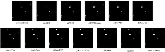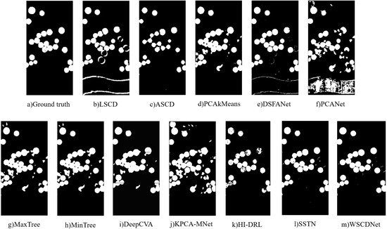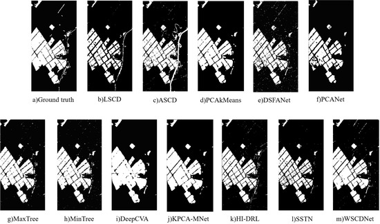 The binary change detection results of WSCDNet and different comparison methods are shown in Table 1, with the best performance metrics highlighted in bold. As demonstrated in the table, WSCDNet generally outperforms other methods, which is also reflected in the visualization results shown in Figure 9, Figure 10 and Figure 11. Among the comparison algorithms, LSCD, PCANet, MaxTree, and MinTree incorrectly identified many unchanged areas as changed, leading to false alarms. Meanwhile, ASCD missed a significant number of changed areas.
