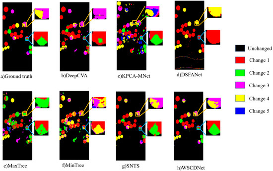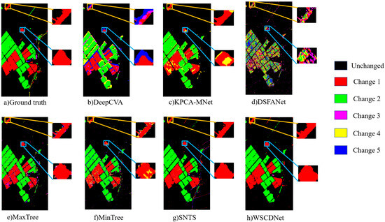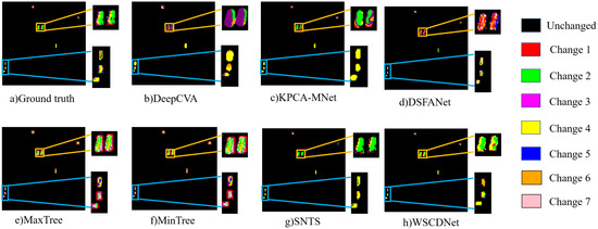 From the perspective of multiclass change detection, WSCDNet achieved high accuracy, as shown in Table 2, along with superior visualization results as illustrated in Figure 12, Figure 13 and Figure 14. Among the comparison algorithms, binary change detection methods such as DSFANet, MaxTree, and MinTree performed less effectively than DeepCVA, KPCA-MNet, SNTS, and WSCDNet, primarily because they only consider the division between changed areas and background regions without extracting features for multiple types of changes. SNTS achieved results closest to WSCDNet across all three datasets due to its consideration of sub-pixel level features. However, WSCDNet outperformed all methods by not only incorporating sub-pixel level features but also implementing multi-granularity perception capabilities for MCD tasks and integrating noisy learning strategies, thereby achieving the best overall results. The high OA values demonstrate WSCDNet’s ability to correctly classify most regions, while the high KAPPA values indicate strong inter-category consistency. This is further validated by the visualization of MCD results, where specific regions are magnified for better comparison of different methods, as shown in Figure 12, Figure 13 and Figure 14. Within these magnified local regions, it is evident that the compared methods suffer from various limitations. For example, DeepCVA, KPCA-MNet and DSFANet generate a large number of false alarms and fail to preserve the true structure of the change areas. MaxTree, MinTree, and SNTS, while performing reasonably well for major change classes, still struggle with boundary ambiguity and misclassification in small-scale regions. In contrast, WSCDNet demonstrates clear advantages in fine-grained change detection. In most regions, it accurately delineates the boundaries between different change classes, effectively suppresses noise, and preserves the detailed spatial structure of complex change regions. This fine-grained discrimination enables WSCDNet to achieve results that are much closer to the ground truth, particularly in challenging and confusing areas, highlighting its superiority in multiclass change detection tasks. However, we could not help noticing that there are some challenges in the detection of minority classes in the Yancheng dataset. The main difficulty lies in the fact that WSCDNet is trained using pseudo-labels that rely on the spectral unmixing process, and the extreme class imbalance in the Yancheng dataset can cause a biased unmixing procedure. This, in turn, affects the detection of these minority class samples. Nevertheless, for the multiclass samples that are not relatively rare, WSCDNet demonstrates significantly better detection performance in confusing regions compared to other algorithms, which still proves its superiority in performing change detection tasks.