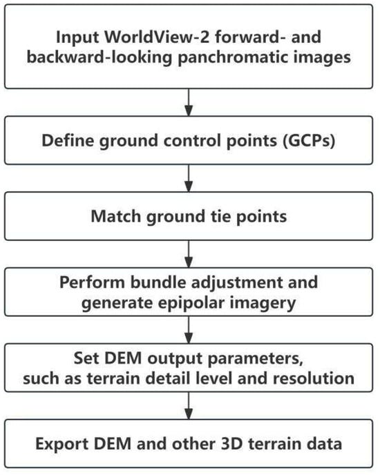 The study area is situated northwest of Wushi County in the Aksu region, Xinjiang, adjacent to the Maidan–Shahylam fault zone. To analyze surface deformation before and after the Wushi earthquake, we acquired multispectral stereo image data from WorldView-2 for February 2019 and October 2024 (Table 1). Using remote sensing software platforms such as PCI (v2016), we extracted high-precision DEMs and corresponding point cloud data from these stereo images, establishing baseline datasets representing pre- and post-earthquake conditions in the Wushi region. However, due to factors such as post-seismic land-cover changes, observational noise, satellite attitude deviations, and image distortions, elevation values for certain pixels exhibit systematic biases, subsequently affecting data accuracy and reliability. Thus, establishing a rigorous data preprocessing and registration calibration workflow is essential prior to extracting vertical displacement fields for the Wushi earthquake. This workflow involves strategically placing ground control points (GCPs), employing refined stereo-matching algorithms, and implementing multi-scale filtering and noise suppression strategies to guarantee sufficient precision and stability in differential analyses. The specific procedural steps (Figure 2) are as follows: