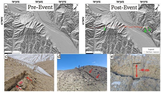 Pre- and post-earthquake topographic datasets derived from WorldView-2 stereo satellite imagery. (a) Pre-earthquake digital elevation model (DEM) of the Wushi Earthquake; (b) post-earthquake digital elevation model (DEM) of the Wushi Earthquake. The red line denotes the co-seismic surface rupture zone interpreted from field investigations and remote sensing imagery; (c,d) field photograph showing co-seismic surface rupture, indicated by the red arrow; (e) co-seismic vertical displacement measured in the field is approximately 40 cm.