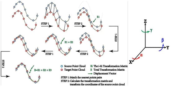 The Iterative Closest Point (ICP) algorithm is a high-precision 3D registration technique based on point cloud data and is widely applied in geomorphic-structural evolution analysis, hazard monitoring, and geophysical investigations []. Its core objective is to perform a rigid-body transformation (including rotation and translation) between two (or more) point cloud datasets acquired at different times, from different perspectives, or using different sensors, thereby achieving optimal alignment in three-dimensional space and minimizing registration errors (Figure 4) []. By iteratively searching for and matching corresponding point pairs, ICP enables the unification of point clouds that initially contain positional discrepancies or observational deviations into a common spatial reference frame. This process provides a high-resolution and finely aligned observational foundation for in-depth studies of terrain relief, tectonic deformation, and geological hazards. When investigating co-seismic deformation using pre- and post-earthquake point cloud datasets, the ICP algorithm plays a pivotal role. Typically, the two point clouds—acquired before and after an earthquake via LiDAR, UAV photogrammetry, or high-resolution satellite stereo imagery—differ in terms of the data source, viewing geometry, and sampling resolution. Through successive iterations, ICP identifies and matches corresponding geomorphic features (e.g., ridgelines, river valleys, fault traces, or other prominent landform textures) and solves for the rigid-body transformation matrix that best aligns the datasets. The algorithm minimizes the Euclidean distance—or other customized distance metrics—between matched point pairs, ultimately yielding optimized registration parameters consisting of both a translation vector and a rotation matrix [].