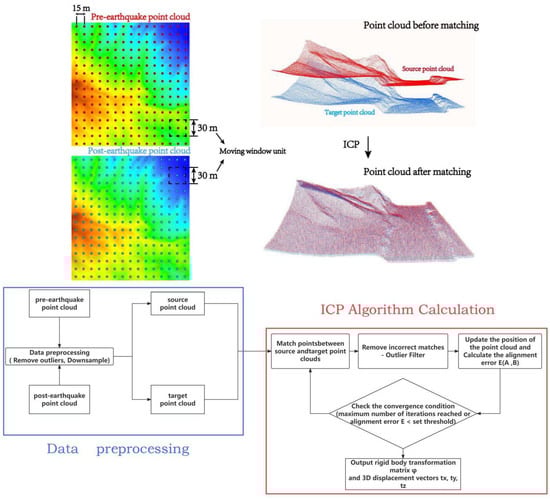 Schematic illustration and workflow of the window-based ICP algorithm for extracting co-seismic displacement vectors from pre- and post-earthquake topographic data. The ICP algorithm was configured with a window size of 30 m, such that each point in the point cloud is assigned the value computed over its local 30 m window, and the window was shifted in 15 m increments.