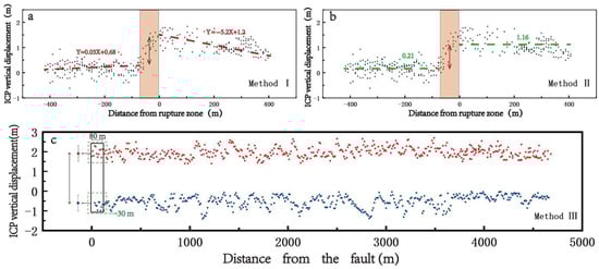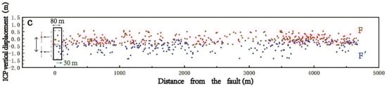 The mean value difference method is a widely used approach for quantifying co-seismic displacement, fault scarp height, and other geological parameters, particularly in studies utilizing three-dimensional datasets such as InSAR, LiDAR, or DEM. Its core concept lies in leveraging the statistical characteristics of point cloud data on either side of a fault to quantify co-seismic deformation through the computation of mean displacement values (Figure 6b). Nissen et al. (2014) [] applied this method in their analysis of the 2011 Fukushima–Hamadori earthquake in Japan, demonstrating its effectiveness and a high degree of automation in earthquake deformation studies.