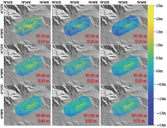 As shown in Figure 11, a homogeneity test of vertical co-seismic displacement values under different window and step length configurations reveals that displacement values within the same area are relatively stable and uniform when the window size ranges between 30–50 m and the step length falls within 15–25 m. Balancing the trade-off between capturing large-scale topographic structures and preserving fine-scale near-fault deformation features, we ultimately selected a window size of 30 m and a step length of 15 m as the optimal parameter configuration. The displacement field derived under this setting exhibits the highest degree of consistency and accuracy, and it was adopted as the basis for subsequent analysis of fault slip characteristics.