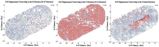To extract co-seismic deformation using the Iterative Closest Point (ICP) algorithm, it is essential to ensure the data quality and accuracy of both pre- and post-earthquake point clouds, as well as the existence of valid overlapping regions between them. On the one hand, a higher degree of overlap and consistency in viewing geometry can effectively reduce uncertainties during the matching process. On the other hand, large discrepancies in point cloud resolution or uneven sampling density may lead to mismatches or convergence issues during ICP iterations. In this study, the ICP algorithm was implemented and optimized within the MATLAB (v2022a) programming environment. Through this approach, the accurate registration of 3D point cloud data was achieved, and the corresponding spatial transformation parameters—namely, the rotation matrix and the translation matrix—were computed. The translation matrix contains a three-dimensional displacement vector that characterizes the spatial distribution of the co-seismic displacement field. Specifically, it captures the strike–slip component along the fault strike, the extensional component perpendicular to the fault, and the vertical displacement component normal to the Earth’s surface.