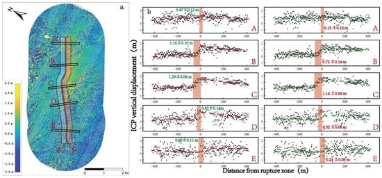 In recent years, the increasing availability of high-resolution three-dimensional topographic datasets, including digital elevation models (DEMs) and light detection and ranging (LiDAR) point clouds, has provided valuable datasets for differential geomorphological analyses, enabling the precise quantification of vertical co-seismic displacement fields across earthquake rupture zones []. Methods involving co-registration and differential analysis of pre- and post-earthquake DEMs, derived from high-resolution stereo imagery, have demonstrated substantial potential for accurately extracting vertical co-seismic displacement fields. In particular, by generating comprehensive displacement maps spanning the entire surface rupture zone and calculating vertical displacement vectors from pre- and post-event point cloud datasets, these approaches effectively produce high-resolution and precise measurements of vertical co-seismic deformation.