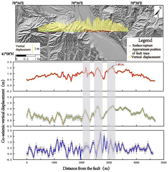Based on the three measurement methods proposed in Section 3.4 (Figure 9), we extracted and calculated near-fault co-seismic vertical displacement values (within 250 m of the fault trace) along the main fault from the northwest to the northeast. As shown in Figure 10, an analysis of sample data within the 0–4600 m distance range reveals that all three methods consistently indicate a decreasing trend in displacement magnitude toward both ends of the fault, with localized uplift occurring in the central segment. Taking the line fitting-based method as an example, the overall vertical displacement values range from approximately 0.2 m to 1.4 m. Notably, peak displacement differences between the hanging wall and footwall are observed in three specific intervals: 2000–2300 m, 2500–2700 m, and 3000–3300 m, each followed by a sudden drop in displacement magnitude. These features suggest that the initiation and termination points of surface rupture or zones of localized stress concentration may be located along these segments of the fault. Further analysis reveals a maximum vertical displacement of ~1.46 m at approximately 3200 m, situated north of the Qialemati River, near the tectonic boundary between the alluvial fan and the bedrock region along the mountain front. All measured vertical displacements are positive, indicating uplift of the hanging wall and subsidence of the footwall, consistent with the thrust-dominated focal mechanism of the Wushi earthquake.