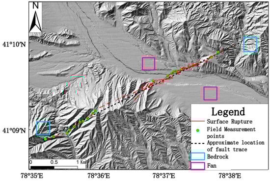 Surface deformation induced by strong earthquakes has consistently been a pivotal focus in seismology and structural geology research. Such seismic events commonly result in pronounced surface ruptures, accompanied by distinctive co-seismic displacement fields [,,]. As direct manifestations of seismic activity, the geometry and spatial patterns of these surface ruptures, together with their corresponding co-seismic displacement fields, explicitly reveal the rupture propagation pathways and intricate dynamic mechanisms underlying earthquakes. Furthermore, these surface expressions encapsulate crucial insights into the variations in stress fields preceding and succeeding seismic events [,,,]. High-precision observations of surface ruptures, coupled with quantitative analyses of co-seismic displacement fields, provide robust evidence that is critical for elucidating rupture dynamics, characterizing fault activity, and identifying the spatial and geometric properties of faults. Such rigorous analysis significantly advances our comprehension of regional stress-field evolution, both temporally and spatially [,,,,]. Additionally, these detailed deformation data constitute an indispensable scientific basis for seismic hazard assessments, emergency response planning following earthquakes, and strategic decision making for disaster mitigation [,].