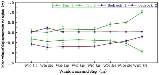 Although the study area is largely free from vegetation, anthropogenic structures, or buildings that could interfere with displacement estimation, it encompasses a range of geomorphic units, including alluvial fans and bedrock zones. Moreover, displacement data in river channel regions are often incomplete or missing. To systematically evaluate the effects of window size and step length, we selected four circular test areas—two on each side of the fault within the fan and bedrock domains—where the vertical displacement field is relatively uniform (Figure 11). Within each test area, 200 evenly distributed sample points were generated, and their vertical displacement values were extracted to compute the local mean. In addition, Monte Carlo error analysis was applied to each test area with 150 simulations, allowing the estimation of uncertainty ranges associated with each computed mean.