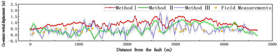Based on the three co-seismic vertical displacement extraction methods described in Section 3.4, we conducted a comparative analysis between the estimated displacement values and field-measured displacements projected along the fault strike. As illustrated in Figure 12, all four datasets exhibit a consistent spatial pattern characterized by lower displacement magnitudes at both ends and higher values in the central segment, with several localized peak concentrations. The range of vertical displacements measured in the field falls approximately between 0.2 and 1 m, while the values derived from the displacement field calculations are generally higher than the field measurements. Only a few field data points exceed the computed values, and these anomalies tend to deviate from the overall trend of continuous spatial variation. This discrepancy may be attributed to the overreliance on prominent surface rupture features during field measurements, potentially leading to errors in identifying the correct reference plane or mistakenly interpreting cumulative displacement as purely co-seismic displacement. Moreover, during seismic events, energy released from deeper crustal levels may propagate toward the surface through fault branches over a broader area. Given that some vertical co-seismic displacement may occur below the surface, field measurements that only capture surface rupture expression could underestimate the true magnitude of the co-seismic deformation field.