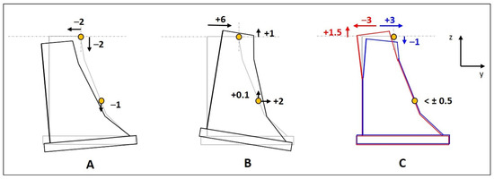 Deformations (in mm) calculated exemplary for two points in the middle of the Diemel gravity dam in Germany (height: 42 m; crest length: 194 m; reservoir capacity: 20 million m3). Predicted deformations are shown in horizontal (y) and vertical (z) direction, caused by the dam’s self-weight (A), the water pressure at full impoundment (B), and temperature-induced displacements during summer (red) and winter (blue) (C). Negative horizontal values indicate a deformation to the upstream side, positive values a deformation to the downstream side (Adapted by Fleischer [25]).