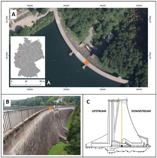 Characteristics of the Glör Dam: (A) Gravity dam with its location in Germany on a digital orthophoto. (B) Side view of the dam’s downstream side. (C) Cross-section of the gravity dam [26,27]. The location of the pendulum system is marked in orange. Orthophoto: GDI-NRW [28], EPSG: 25832.