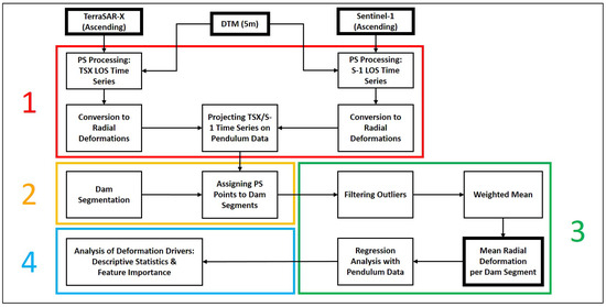 The methods applied in this study can be divided into four sections: (1) the PS analysis, (2) the segmentation of the dam, (3) the comparison of the combined PS time series with in situ pendulum data, and finally, (4) the identification of its deformation drivers. The general workflow is shown in Figure 3.