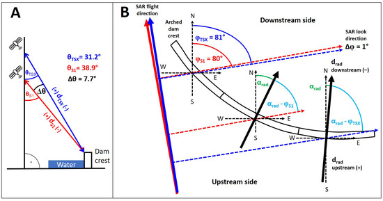 Illustration of the applied projections for TerraSAR-X (, blue) and Sentinel-1 LOS geometry (, red) into radial deformation estimates: (A) Projection of the TSX and S-1 incidence angle (, ) onto the horizontal plane, applying Equations (1) and (2). (B) Projection of the TSX and S-1 look direction (, ) to convert horizontal deformations into radial values (), applying Equations (3) and (4). The difference between the sensors’ look directions differs by only 1°.