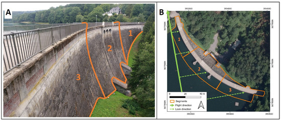 Segmentation (in orange) of the Glör Dam as viewed from the downstream side (A) and on a digital orthophoto (B). Segments 1–3 cover both sides of the dam. The ascending flight direction heads toward 350° and is shown in bold green. The dashed green lines indicate the look direction of the sensors (80°). Orthophoto: GDI-NRW [28], EPSG: 25832.