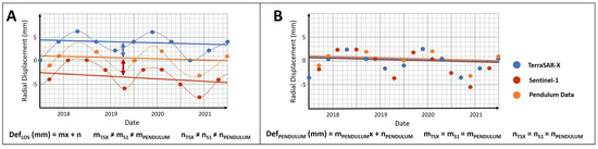 Due to the arched shape of the Glör Dam, both axes’ orientations change for each PS point, and thus, the angle between the absolute north and the radial axis changes as well [19]. To convert the horizontal to radial deformations, we followed the same methodology as applied in Ziemer et al. [36]. These displacements can be directly compared to the pendulum measurements in the horizontal plane and are referred to as in the following. Equations (3) and (4) represent the conversion for TSX and S-1, respectively: