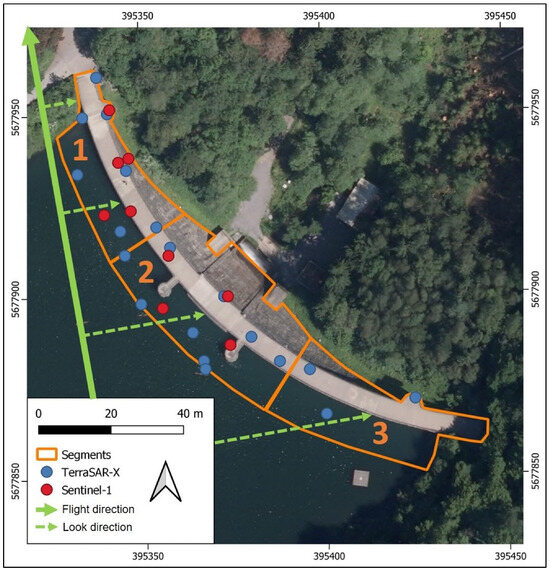 The Glör Dam was divided into three segments with similar widths (56 m)—one in the middle and two on the sides. Given the relatively small size of the dam, using three segments was sufficient, as a greater number would have resulted in an insufficient number of PS points per segment. For this reason, no subdivision into vertical segments was conducted. However, for larger dams (i.e., height > 50 m; crest length > 200 m), a more comprehensive segmentation into crest and toe segments may be appropriate. The segment boundaries on the upstream side of the crest were slightly shifted toward the water to account for sensor-specific differences in SAR geometry, which can approximately correspond to the size of the sensor’s pixel footprint (see Table 2). Due to geometric distortions (i.e., layover and foreshortening) interacting with the water level of the reservoir and the dam wall (i.e., double-bounce effects) [18], maximum shifts of 10 m were expected.