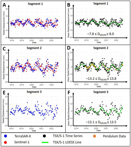 Mean radial deformation () for all segments of the Glör Dam divided by SAR sensor (left) and fitted with a LOESS regression (right). (A,B) Western Segment 1. (C,D) Middle Segment 2. (E,F) Eastern Segment 3, which only consists of TSX PS points. Due to the location of the pendulum system at the center of the dam, PS time series were compared to pendulum data only in Segment 2 (orange). The radial deformation amplitude is given as an interval in millimeters.