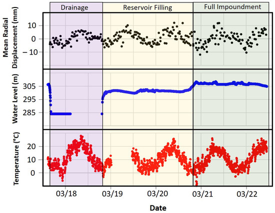 The temperature was identified as the long-term component for periodic deformations of the gravity dam. The drainage of the Glör Dam indicated that these deformation patterns are completely independent of water level, and thus, the thermal expansion of the dam could be made responsible for the total deformation during this period. With the reservoir filling after renovation, the variance in the PS time series increased from 0.9 to 3.9 mm in RMSE, indicating that the water level is more responsible for short-term variations in the SAR signal. With the full impoundment of the reservoir, the mean amplitude of deformation decreased about 1.7 mm toward the downstream side of the dam as a result of the higher water pressure. The last five meters of water level rise resulted in higher feature importance due to interaction effects with temperature.
