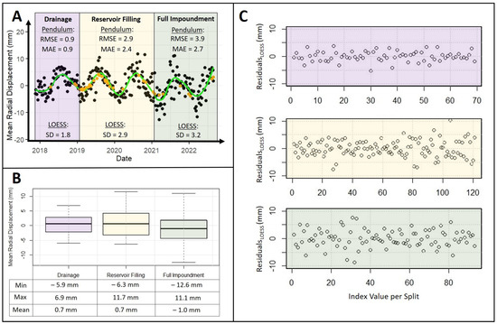 Interesting patterns in the behavior of the SAR signal were observed during the reservoir filling and the first full impoundment following the renovation of the dam (Figure 10). While the RMSE and MAE for the pendulum data remained below 1 mm during the drainage phase, these errors increased during reservoir filling to 2.9 mm (RMSE) and 2.4 mm (MAE), reaching their maximum during full impoundment with 3.9 mm (RMSE) and 2.7 mm (MAE) (Figure 10A). The standard deviation from the LOESS regression was also minimal during drainage (1.8 mm), rose to 2.9 mm during reservoir filling, and peaked during full impoundment, exceeding 3 mm. This trend is also evident in the residuals of the LOESS regression (Figure 10C), which show increasing variance around the LOESS line from drainage to full impoundment.