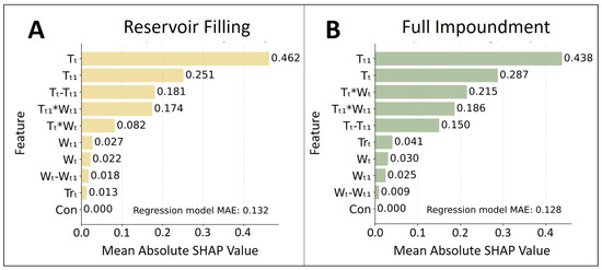 Mean absolute Shap values during reservoir filling (A) and full impoundment (B). The sum of all variables on the model impact is 1. Notably, the importance of W increases through interaction effects during full impoundment.
