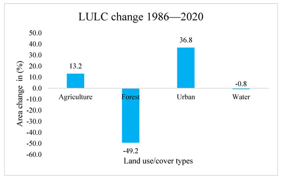 Table 4 displays the extent of change in various LULC classes from 1986 to 2020 as well as the intermediary years. Figure 4, Figure 5 and Figure 6 depict the magnitude of land change associated with each indicated LULC type in this study, both in diagrammatic and graphic formats. In addition, the specific direction of these changes is shown in Table 4. A virtual analysis of these images indicates that there has been a significant change in LULC type in this study area. For instance, the urban area significantly increased from 1986 to 2020. On the contrary, the forest area reduced remarkably over the same period.