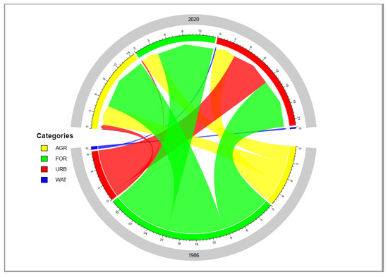 Change in LULC categories (AGR—Agriculture; FOR—Forest; URB—Urban; and WAT—Water) in Limbe City between 1986 and 2020.