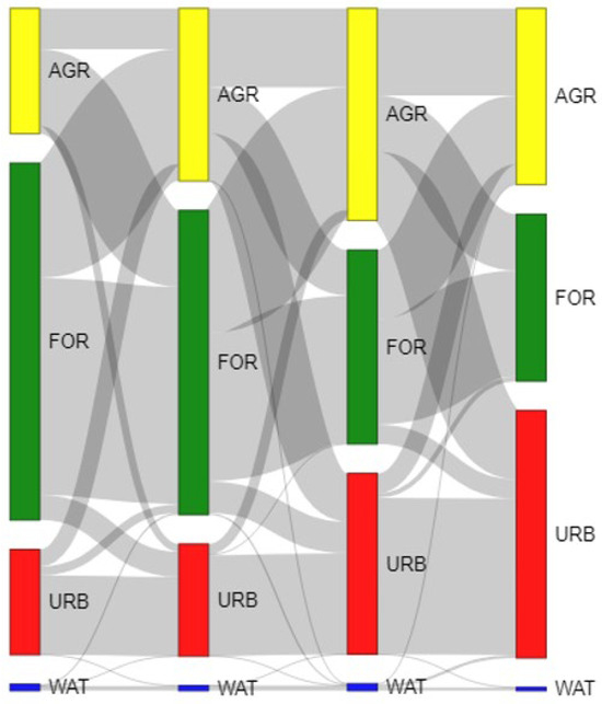 Magnitude and transformation of the different LULC types (AGR—Agriculture; FOR—Forest; URB—Urban; and WAT—Water) change in Limbe City from 1986 to 2020.
