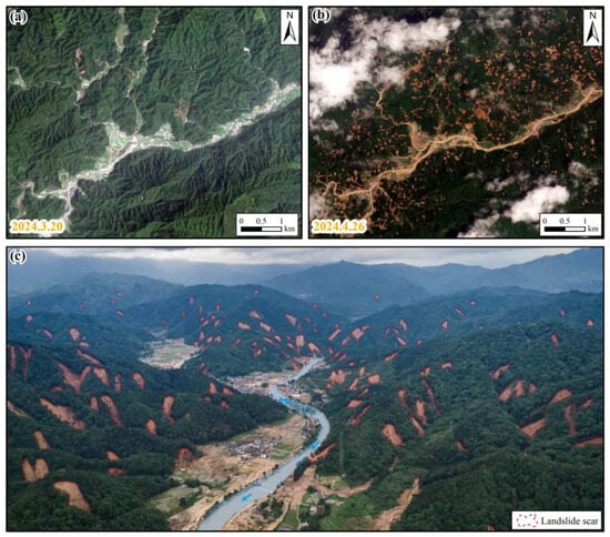 In April 2024, Wujiang District of Shaoguan City in Guangdong Province, China experienced persistent extreme rainfall, with localized torrential and exceptionally heavy precipitation. Jiangwan Town recorded a cumulative rainfall of 576.4 mm between 18 and 26 April, including a historic three-hour record of 126.2 mm from 06:00 to 09:00 on 20 April. This event triggered severe flooding and widespread landslides (Figure 1), causing critical infrastructure failures (water/power/communication outages) for nearly 36 h and posing significant threats to life and property. The disaster prompted rapid emergency response and damage assessments by authorities [,]. Given increasing frequency of extreme weather events and geological hazards, rapid and accurate identification of rainfall-induced landslides is crucial for emergency management, risk assessment, and mitigation planning.