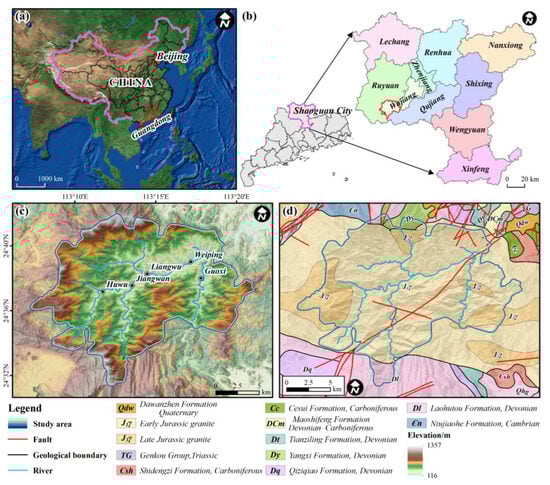 Topographic and geological condition of the study area: (a) Location of Guangdong Province in China; (b) Location of Jiangwan Town within Shaoguan City; (c) Topographic map; (d) Geological map (Data source: 1:20,000 Digital Geological Map Spatial Database of China []).