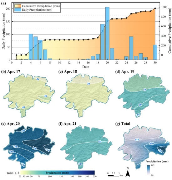 Characteristics of April 2024 rainfall in the study area: (a) Monthly rainfall recorded at the Shaoguan meteorological station; (b–f) Daily rainfall distribution in Jiangwan Town from 17 to 21 April; (g) Cumulative rainfall distribution in Jiangwan Town from 17 to 21 April.