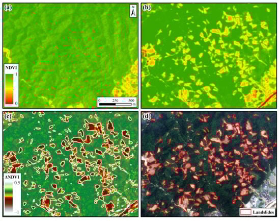 Following this post-processing sequence, a refined landslide distribution map was generated (Figure 4d).