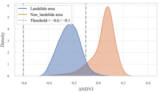 We plotted the density distribution of ΔNDVI values for both landslide areas and non-landslide areas (Figure 5). The range of −0.6 < ΔNDVI < −0.1 was found to encompass the majority of landslide occurrences, and thus was selected as the optimal threshold interval for automated landslide extraction (Figure 4c). However, unavoidable environmental noise—such as bare soil, water bodies, and shadows []—significantly interfered with the extraction accuracy, resulting in commission and omission errors.