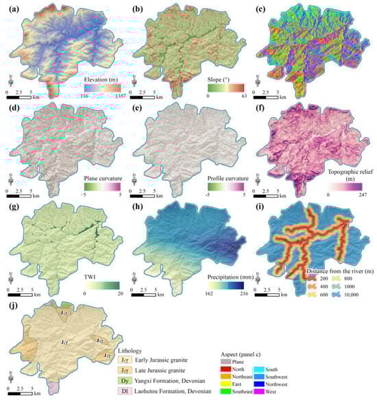Factors for LSM: (a) Elevation; (b) Slope; (c) Aspect; (d) Plane curvature; (e) Profile curvature; (f) Topographic relief; (g) TWI; (h) Precipitation; (i) Distance from the river; (j) Lithology.