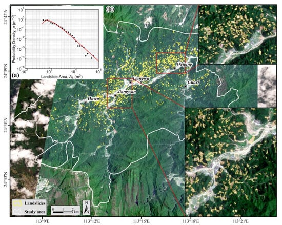 Inventory of landslides induced by the 20 April 2024 extreme rainfall event in Jiangwan Town: (a) PDF of landslide areas fitted by the inverse gamma distribution; (b) Spatial distribution of landslides.