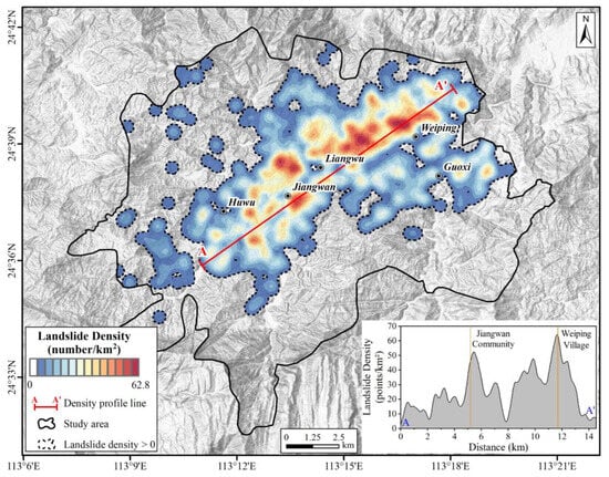 Landslide number density analysis using a 500 m search radius revealed a peak density value of 62.8 landslides/km2. Geographically, landslides concentrated primarily in the northeastern and central sectors of the study area (Figure 9).